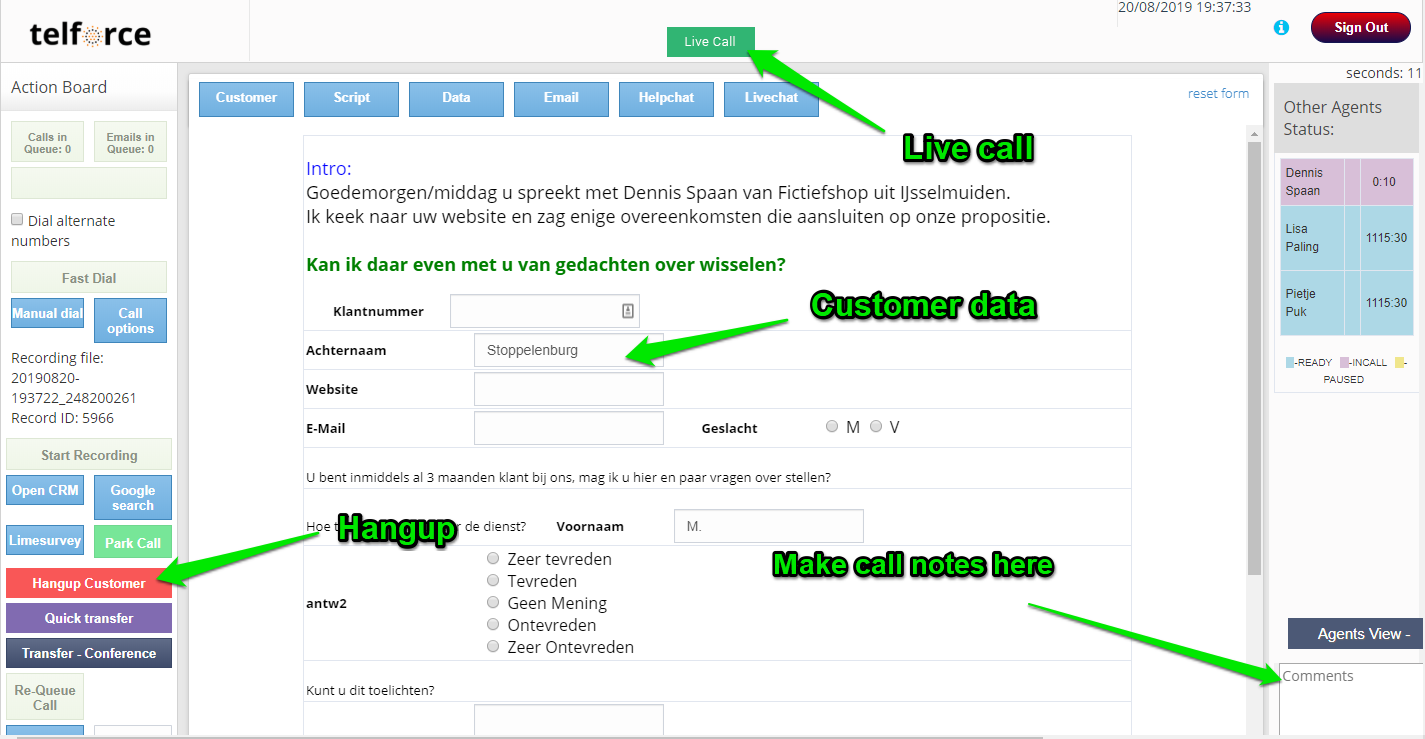 With the red button at the bottom left you can Hang up and thus end the conversation. You will then automatically be taken to the disposition screen. Do you want to process a few things after the conversation is finished? Then tell the customer goodbye and do not press the Hang up button, do your administrative work and only then click Hang up.