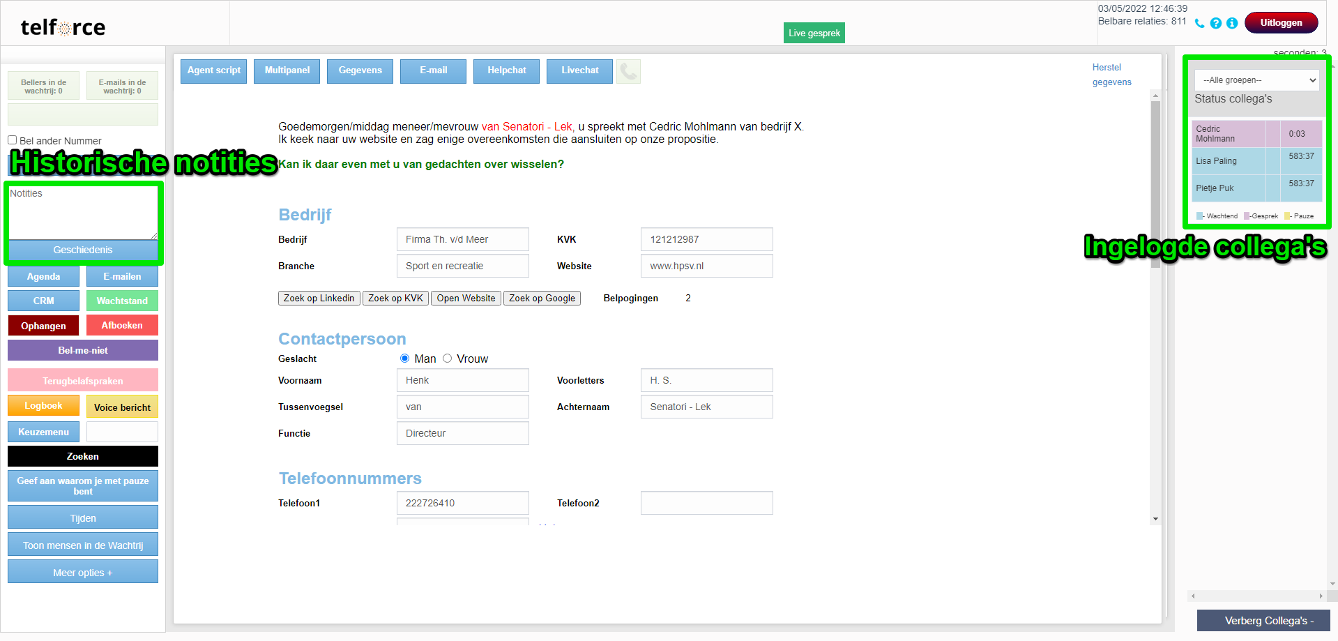 Aan de rechterzijde kun je zien welke van jouw collega's zijn ingelogd en of ze in gesprek, met pauze of aan het wachten zijn. Aan de linkerzijde heb je een vakje waar je notities kunt maken tijdens het gesprek.