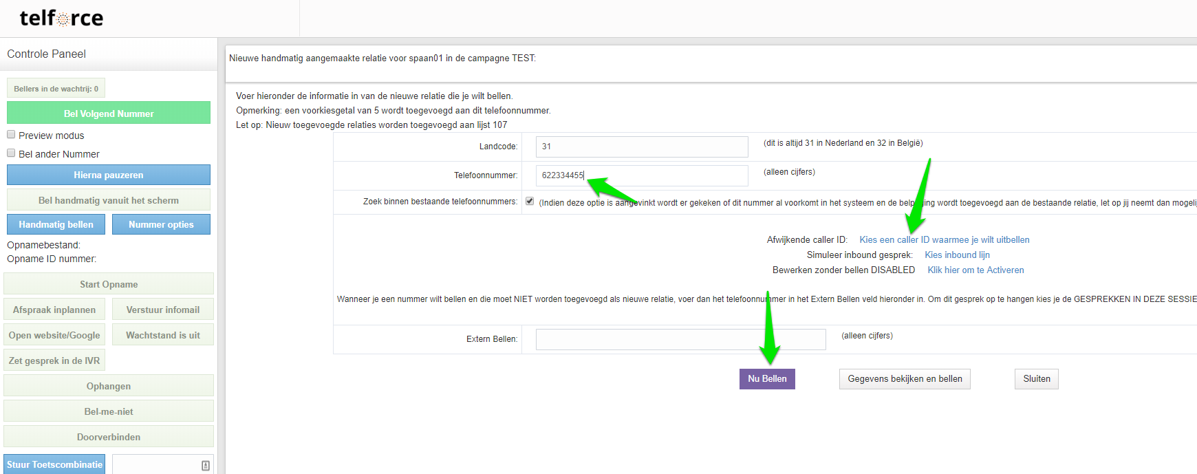 Wanneer je de button 'Handmatig bellen' gebruikt in het linker panel kom je op een nieuwe pagina waar je de landcode en het nummer kunt invoeren die je wilt bellen.